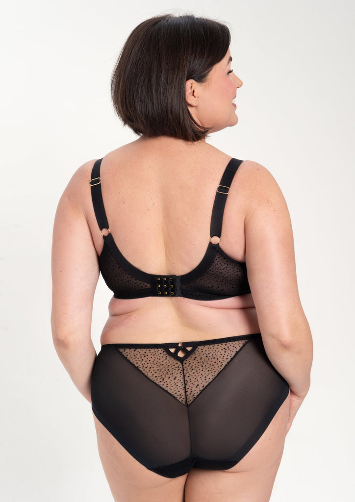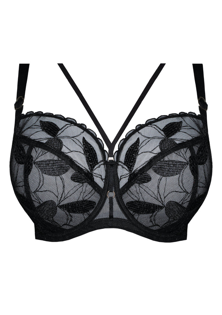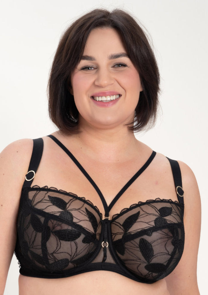 Looking for a sexy, sheer, black bra? Look no further! Kendall is saucy little balconette for fuller busts. Beautiful, flat embroidery across the cups and optional additional straps for a cage bra effect really kick things up a notch.