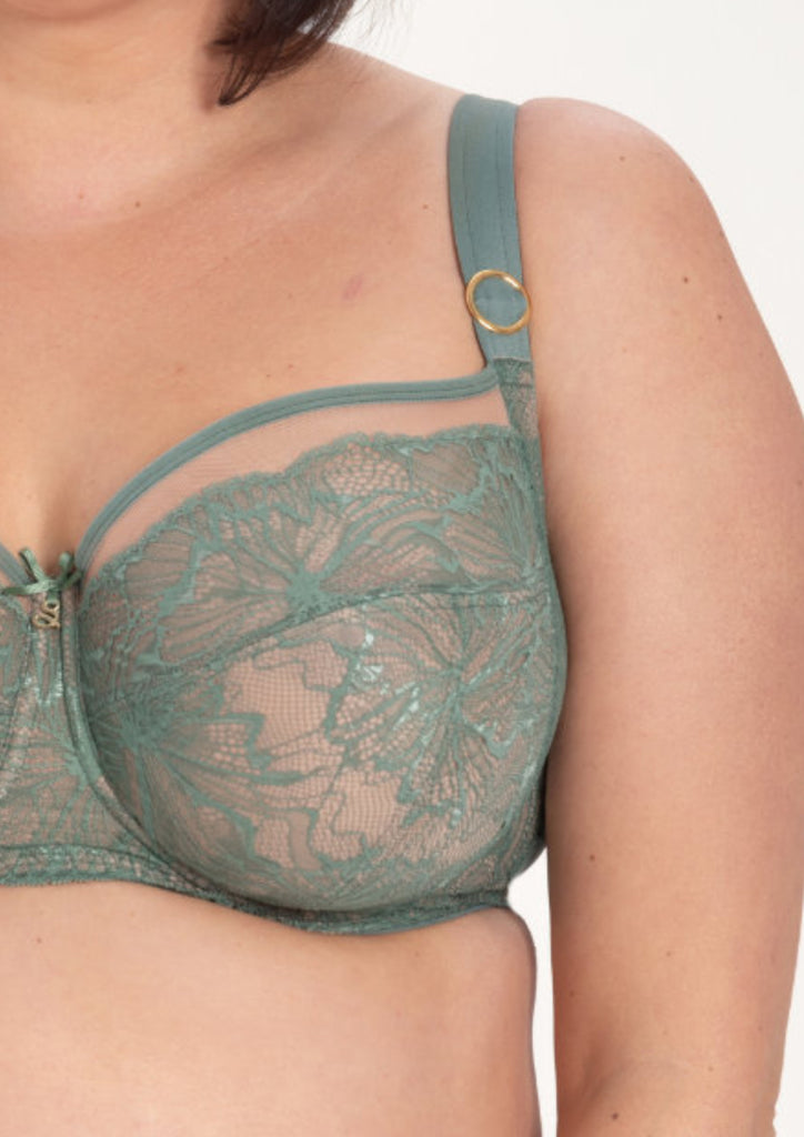 Soft, sage, and saucy? Yes, please! This lacy balconette bra gives that signature Polish lift we love, with a strappy illusion for a little oomph. Soft Italian lace (in a totally dreamy shade!) is all over this bra, featuring a cornflower motif inspired by the Beskid mountains where the bra was made.